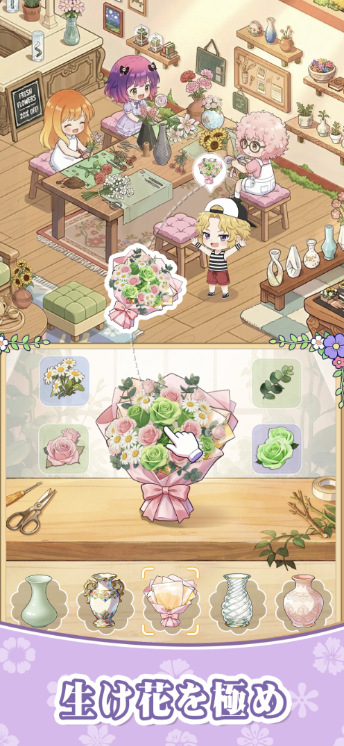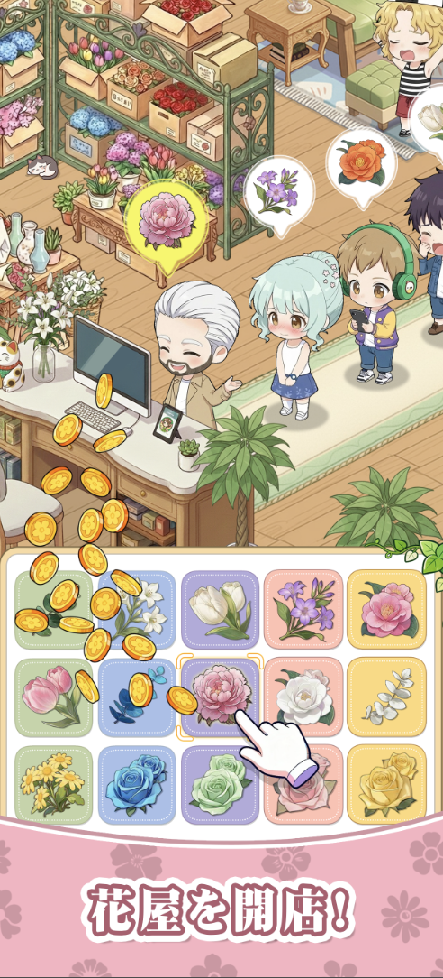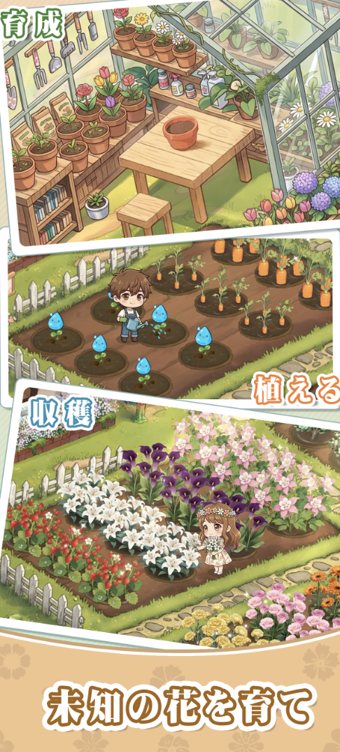 現実の花(バラ・チューリップ・ひまわりなど)から幻想的なファンタジー植物、季節限定の特別種まで多彩なラインナップ。時間経過とともに新しい植物が解放されていくので、図鑑コンプリートを目指す楽しさが長続きします。