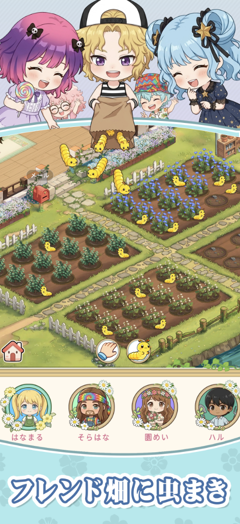 友達の牧場がどんな植物で彩られているか覗けます。「この花どうやって手に入れたの?」という会話のきっかけにもなり、ゲーム外のコミュニケーションも生まれます。
